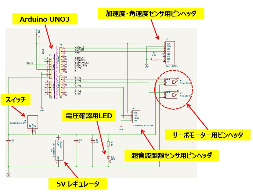- サーボモーター用の電源は、Arduino UNO R3のVinの電圧を5V レギュレータ(LM7805)で安定化し供給する
