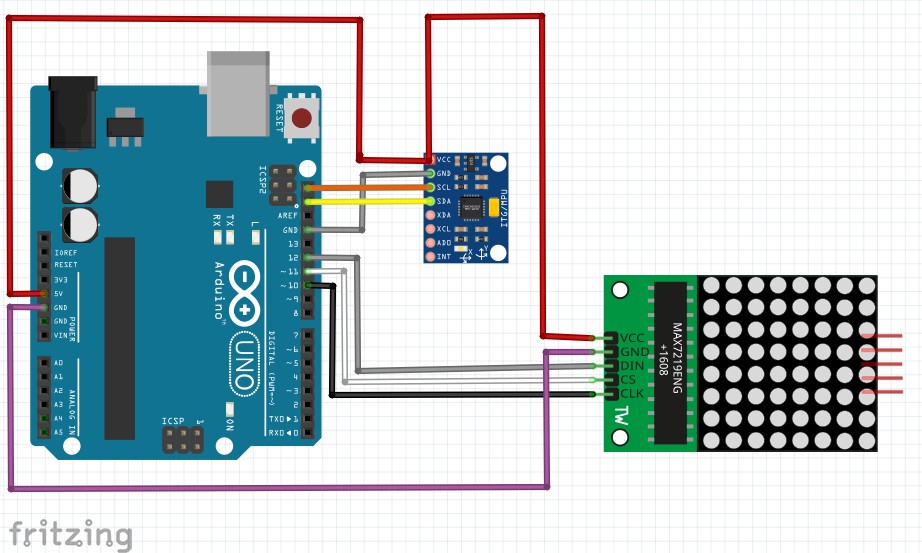 - [ArduinoでLED-Matrixを操作しました]でArduino UNOにLED-Matrixを接続しました。GY-521(MPU6050)を追加で配線します。