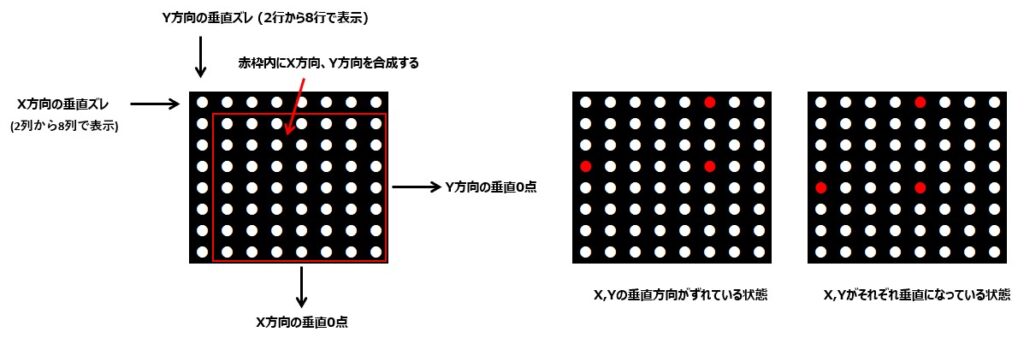 - GY-521(MPU6050)で計測したX軸とY軸の垂直方向の角度をある範囲でドットに表示させ。X軸とY軸ともに垂直になった時に中心部の水平5列目、垂直5列目のLEDが点灯するようにします。円形水準器(サークルレベル)で水平を合わせるときに気泡が中心になるように水準器を乗せた機器の高さを合わせますが、そのようなイメージになるのではと考えています。